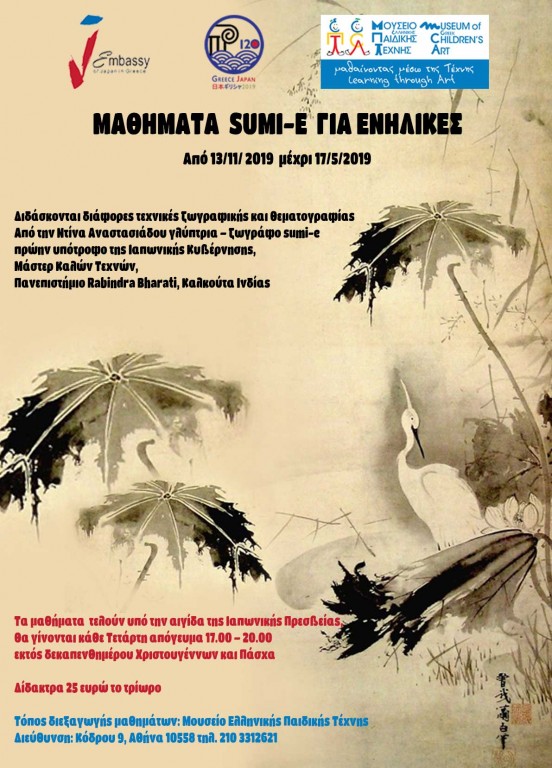 Το Μουσείο Ελληνικής Παιδικής Τέχνης σε συνεργασία με την εικαστικό Ντίνα Αναστασιάδου προσφέρει την δυνατότητα στους ενήλικους που θέλουν να γνωρίσουν τα μυστικά του Ιαπωνικού Sumi-e να παρακολουθήσουν μια σειρά μαθημάτων και διαλέξεων.